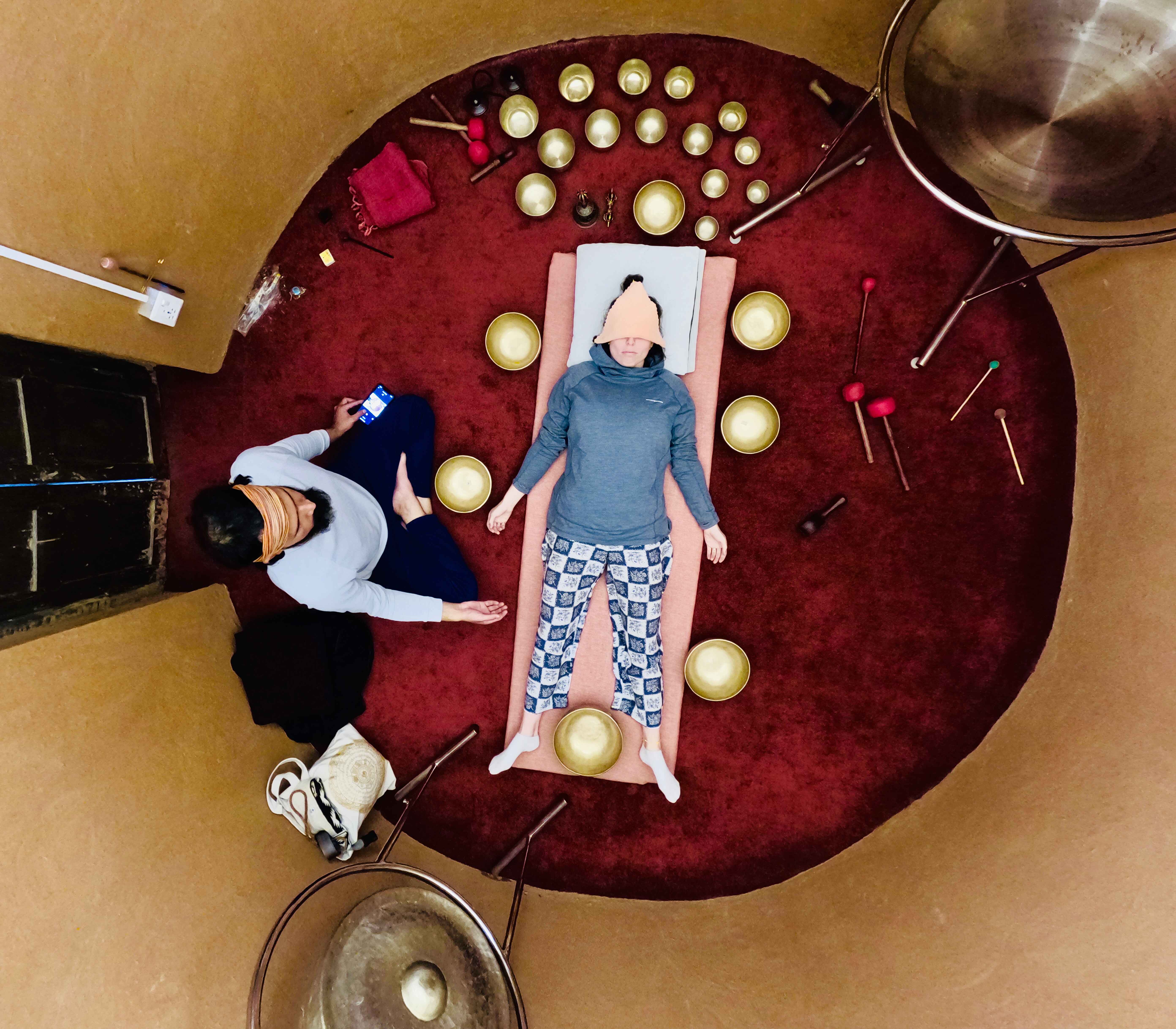 Inside the healing stupa, we use various healing tools like gongs, bells, ting shaws, singing bowls, and other sound-producing instruments. These tools are arranged to harmonize and produce healing sounds that resonate throughout the dome. This creates deep vibrations within the body and fosters a profound sense of silence in the mind, allowing participants to immerse themselves in a cosmic symphony.